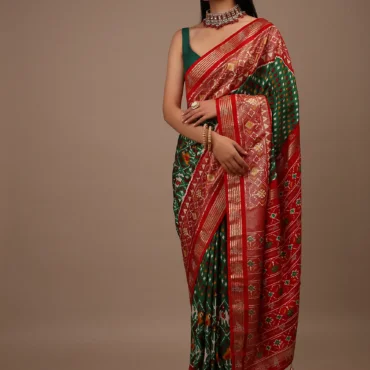 Bottle Green Saree In Silk With Multi Colored Patola And Foil Print And Contrasting Red Border