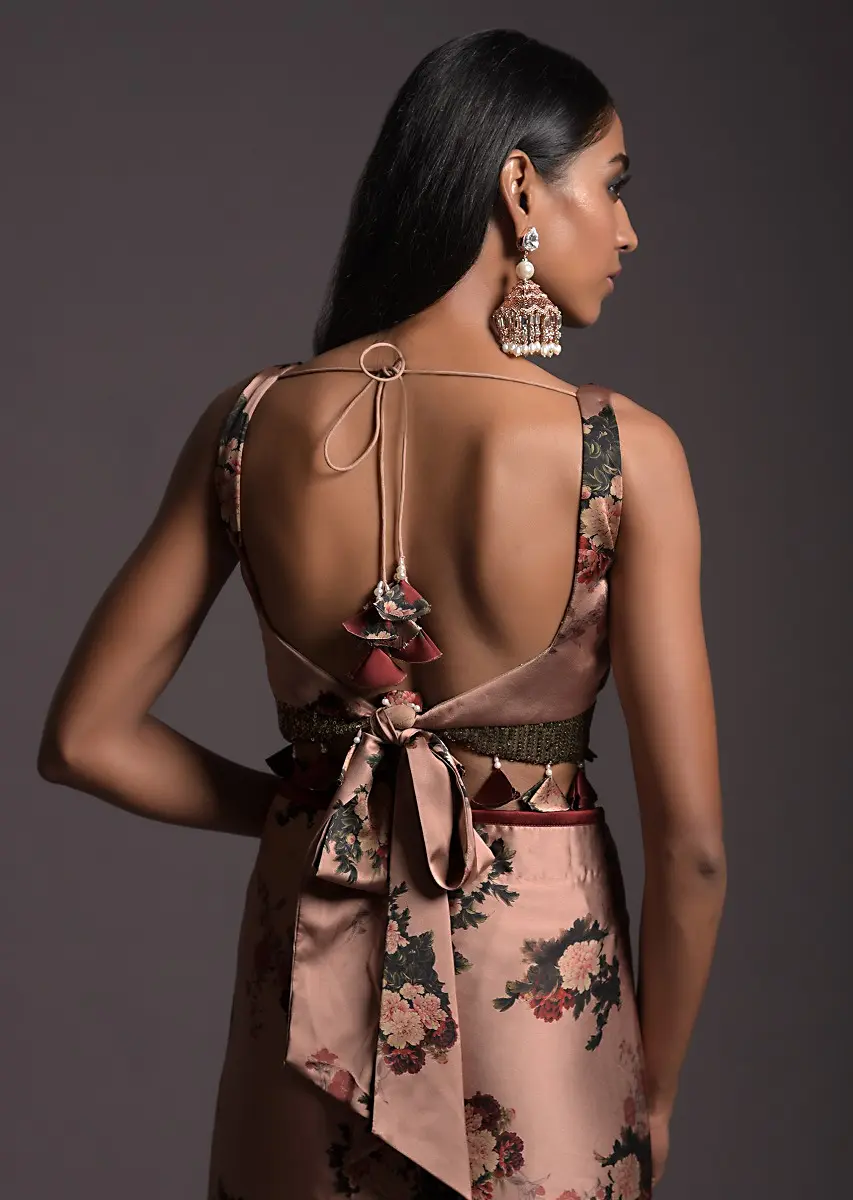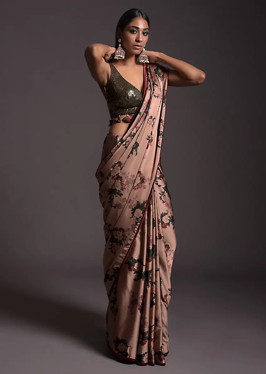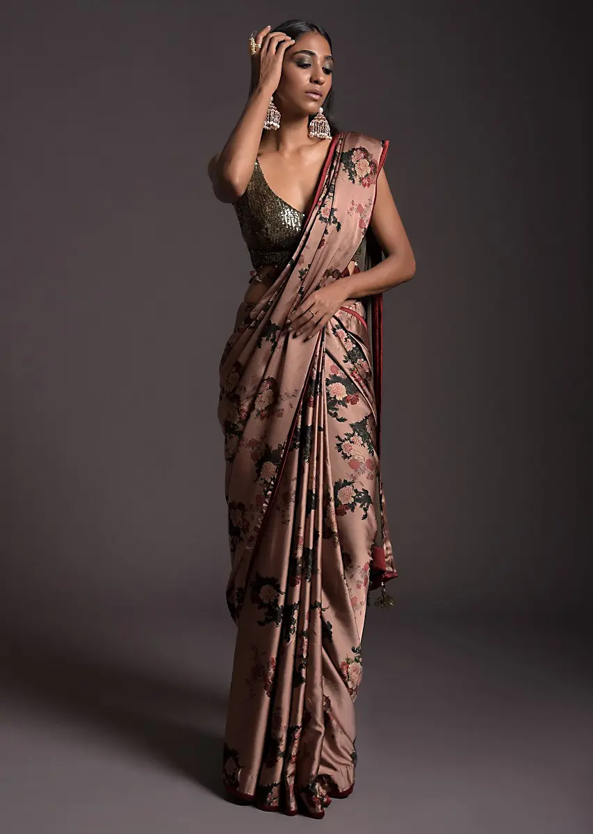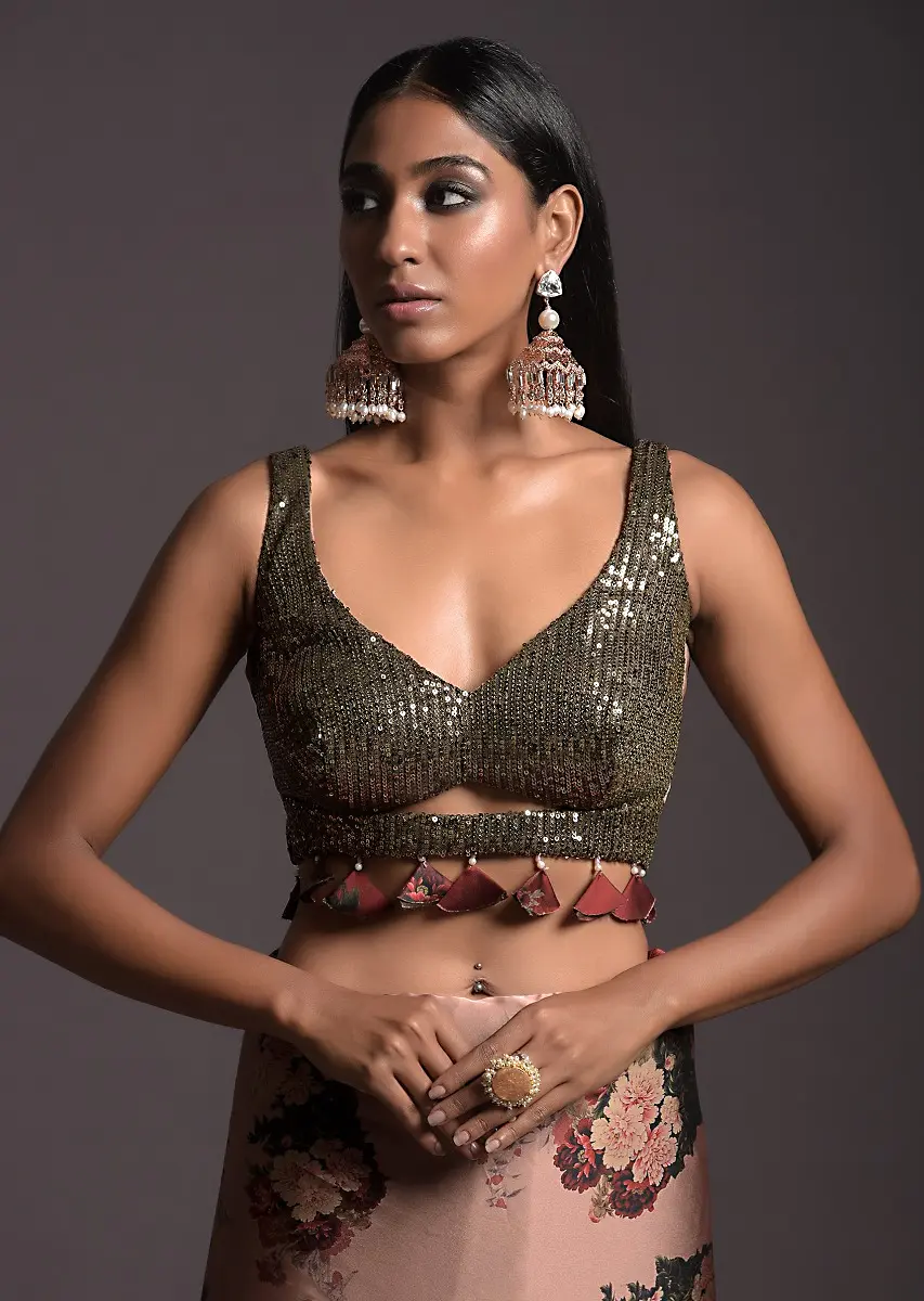 Copper Peach Saree In Satin With Floral Print And Olive Sequins Embellished Crop Top