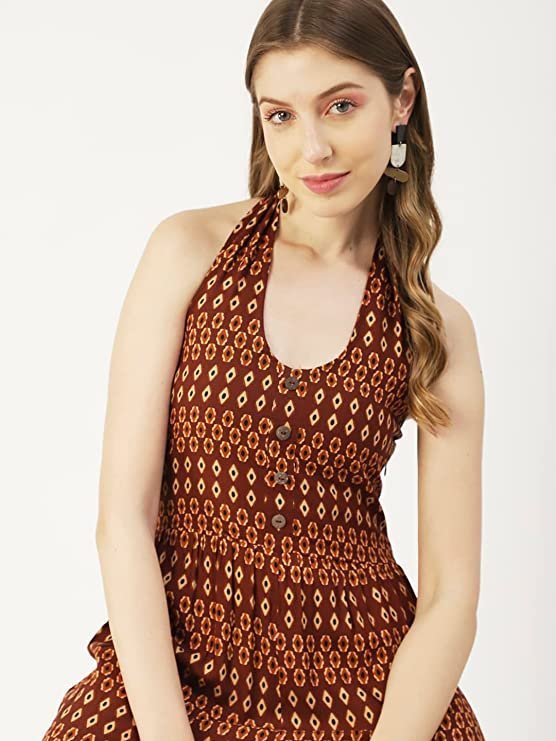 • Features: deep halter neck, sleeveless, front buttoned, high waist, flared bottom, lightweight and all over printed pattern