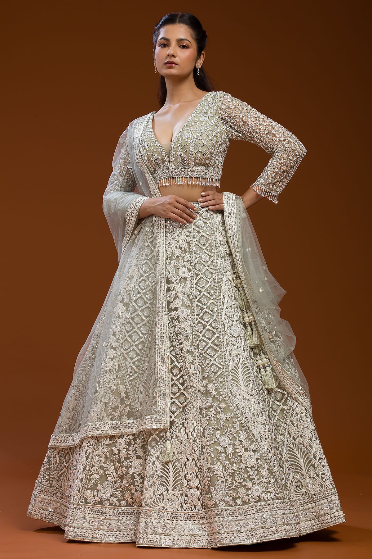 Light Grey Sequins Embroidered Net Sangeet Lehenga