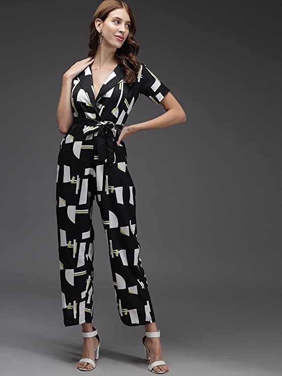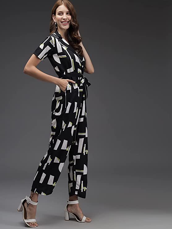 - Stylish and unique printed Jumpsuit with high on fashion colors. Best choice for workout, casual. Round Neck, Crepe Fabric, elastic waistband.